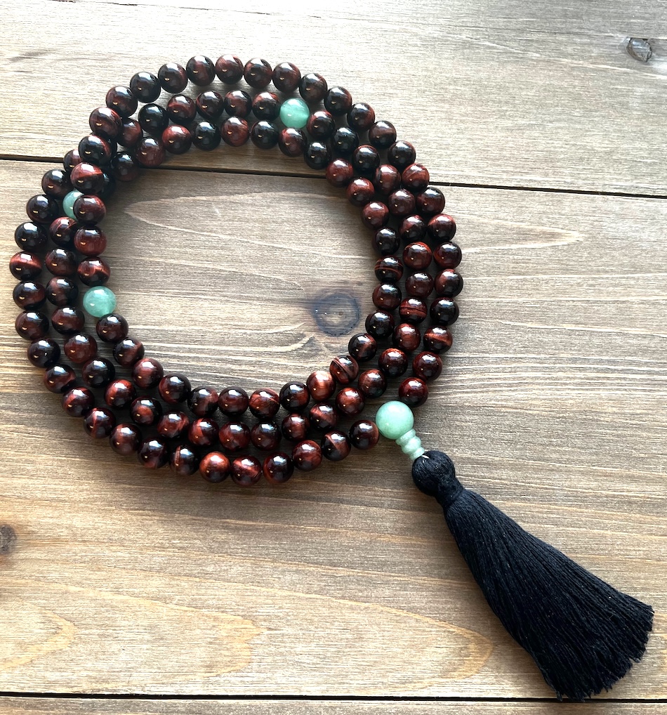 This mala has 108 counting beads, plus markers after the 21st and 54th beads, finished with a guru bead and tassel or adjustable knot. Many mantra practiced require 21 recitations.